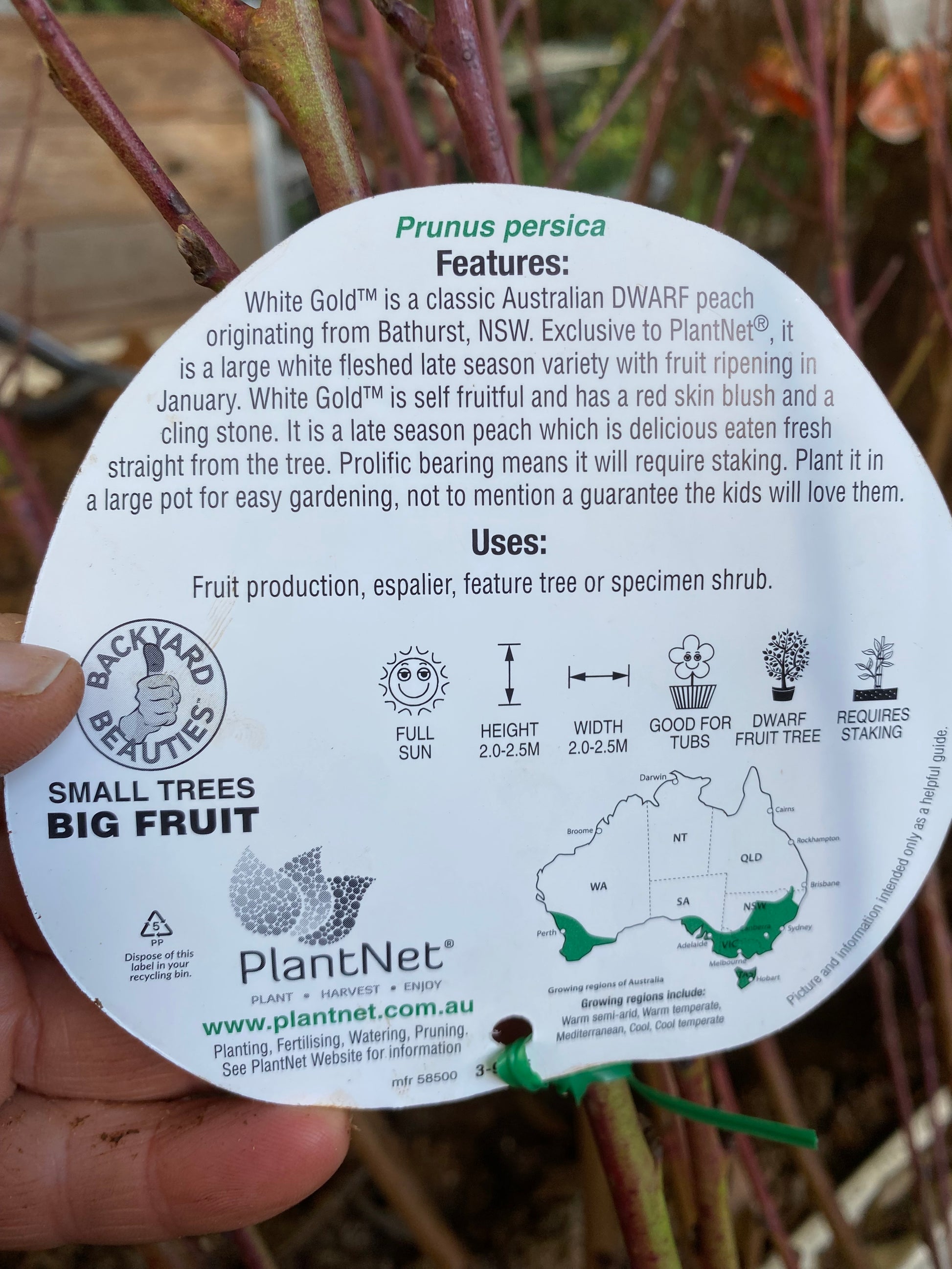 White Gold™ is a classic Australian DWARF peach originating from Bathurst, NSW. Exclusive to PlantNet®, it is a large white fleshed late season variety with fruit ripening in January.